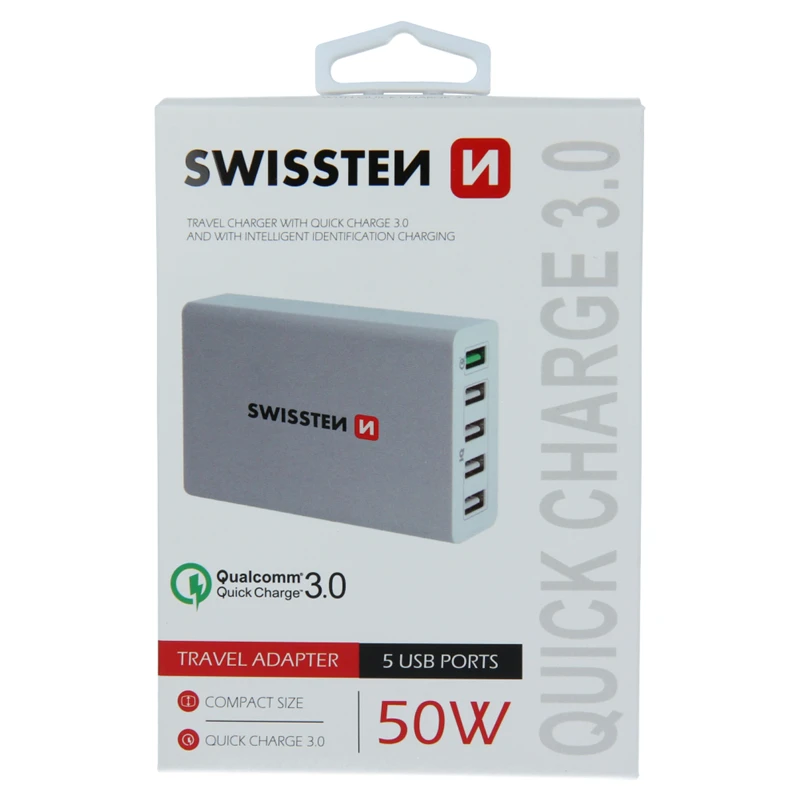 Swissten travel charger with QUALCOMM 3.0 QUICK CHARGE and SMART IC. The adapter has 5 USB ports and an incredible 50W power. The package includes a separate power cable to the adapter. Packed in Swissten retail packing.